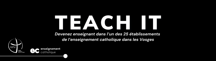 Avec Teach It, nous vous faisons rencontrer des enseignants issus des 25 établissements de l’enseignement catholique dans les Vosges. Nous vous faisons goûter leur passion de l’enseignement et nous vous invitons à les rejoindre. Laissez-vous inspirer, franchissez le pas et devenez enseignant pour l’enseignement catholique dans les Vosges.